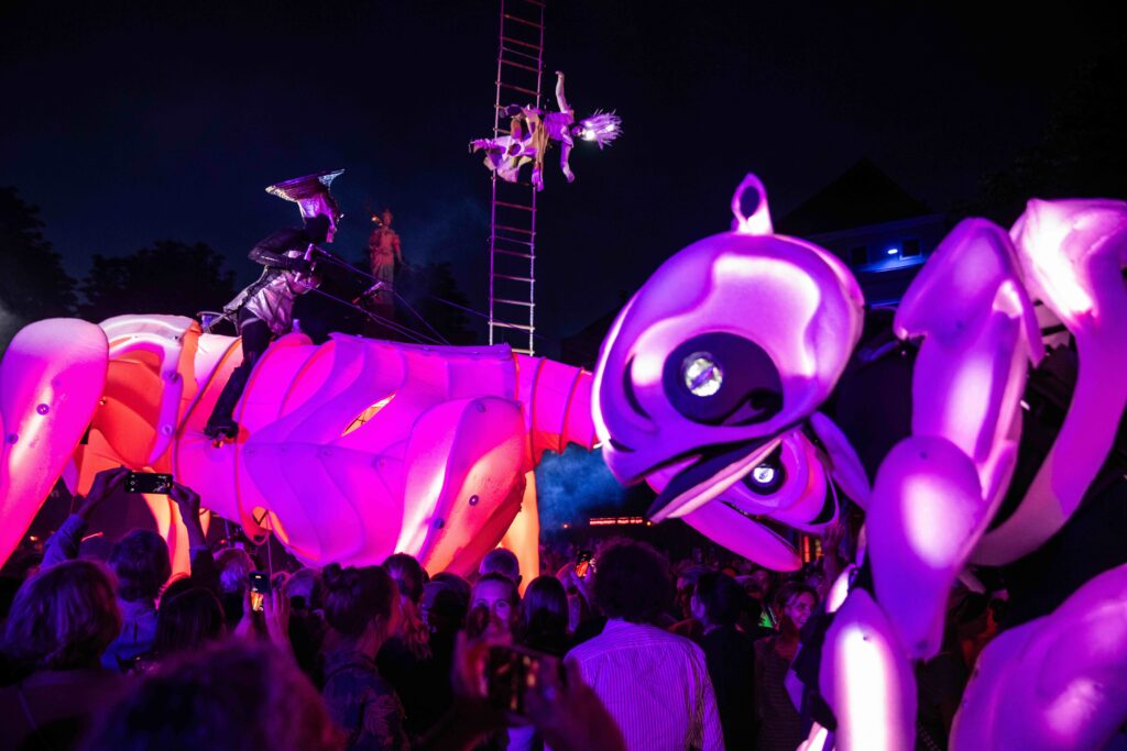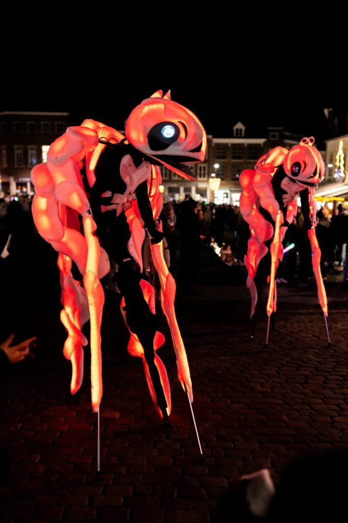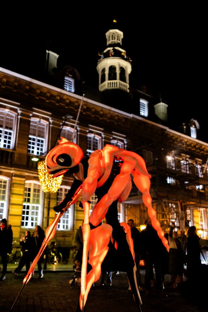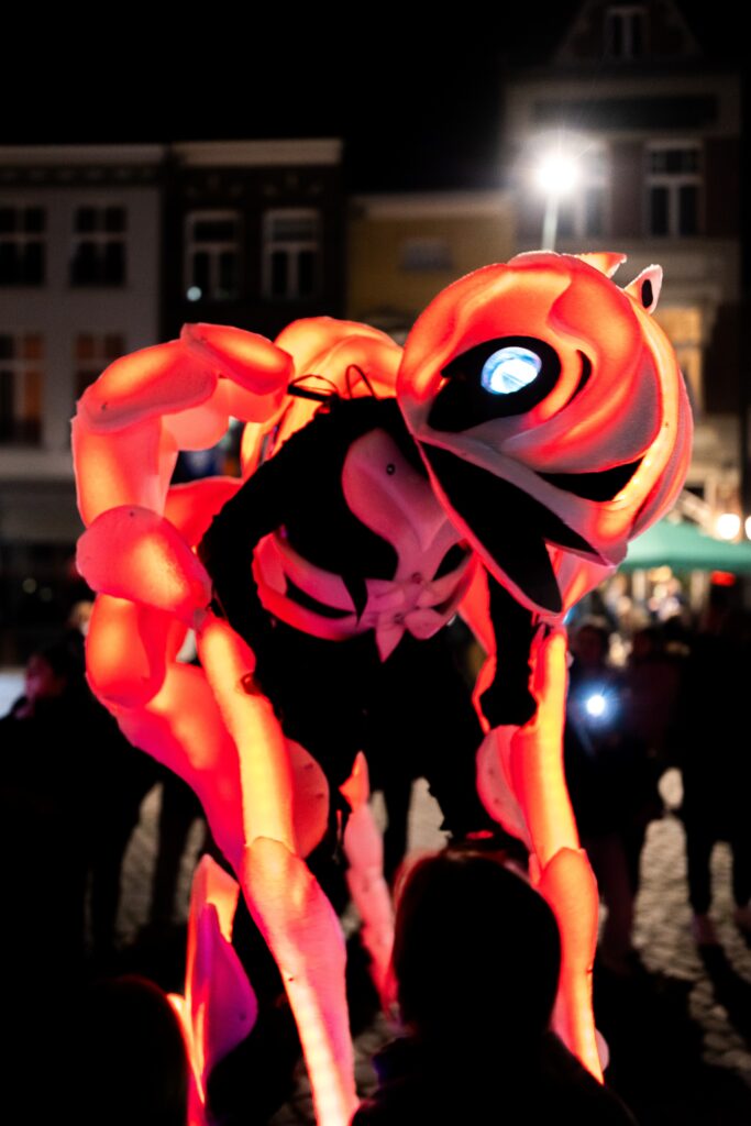 By night a fire player with hand flares can be added. The hand flares create a magical lighting effect for the spectacle.