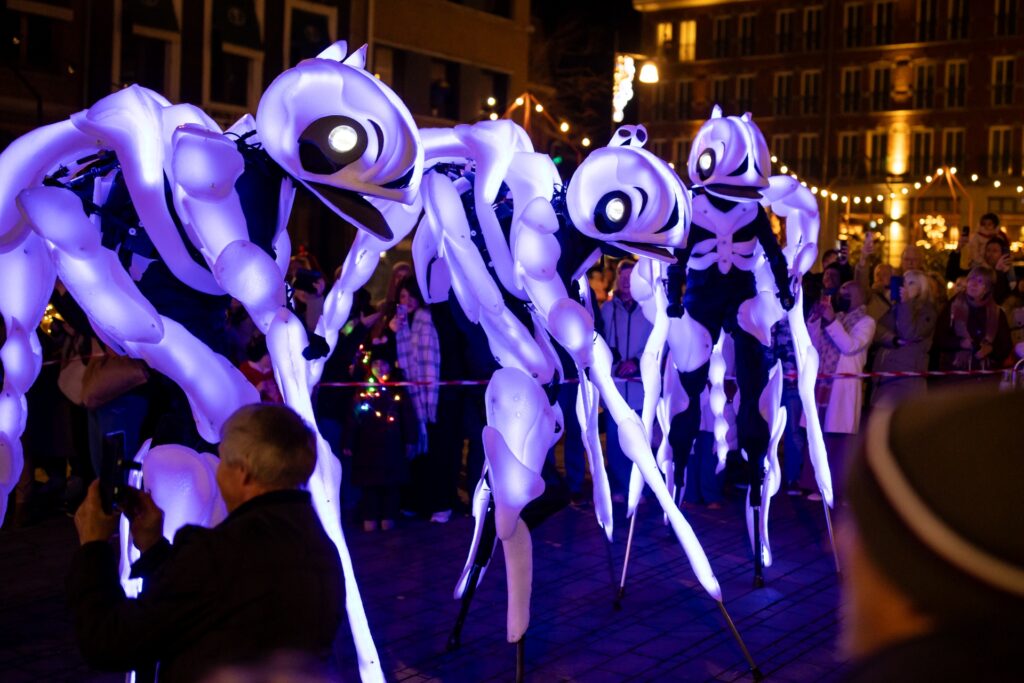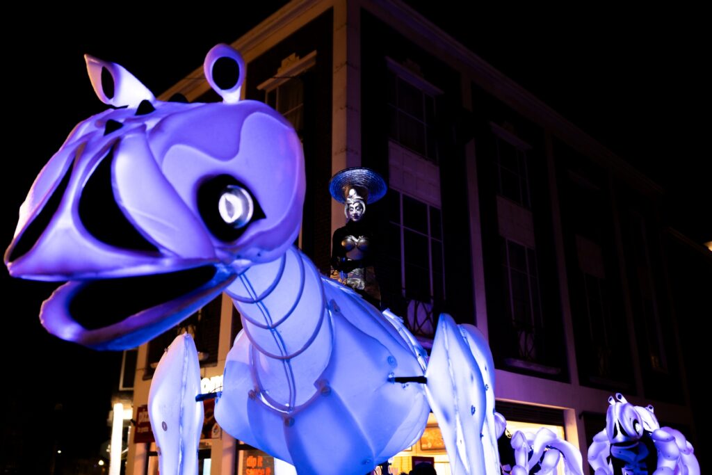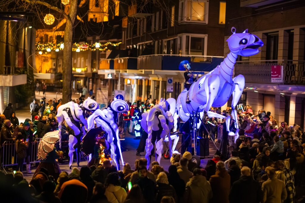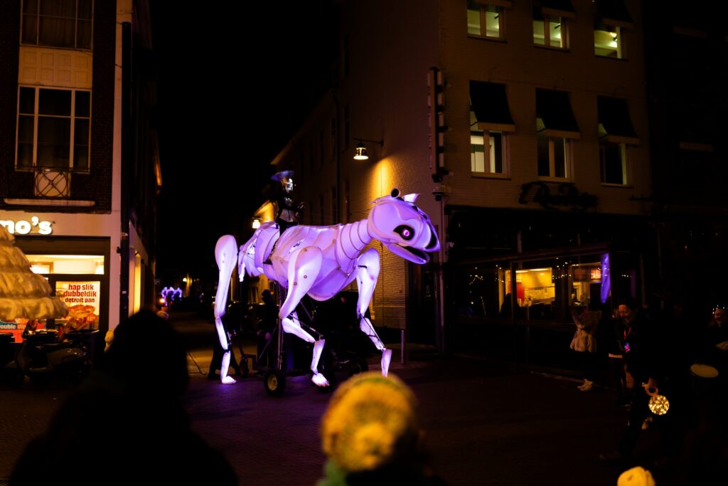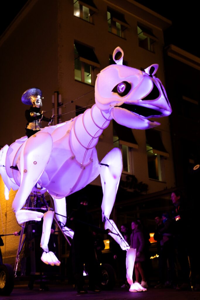 By night a fire player with hand flares can be added. The hand flares create a magical lighting effect for the spectacle.